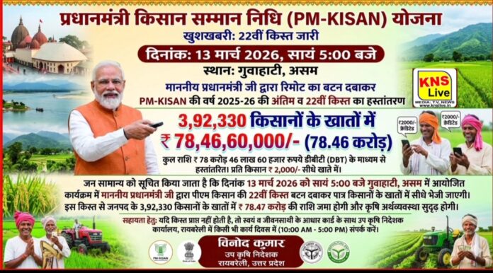 ​उप कृषि निदेशक, रायबरेली, विनोद कुमार द्वारा जन सामान्य को दी गई जानकारी के अनुसार, दिनांक 13 मार्च 2026 को सायं 5:00 बजे असम के गुवाहाटी में आयोजित एक भव्य कार्यक्रम में माननीय प्रधानमंत्री जी शिरकत करेंगे। इस कार्यक्रम में प्रधानमंत्री जी द्वारा रिमोट का बटन दबाकर डायरेक्ट बेनिफिट ट्रांसफर (DBT) के माध्यम से देश भर के पात्र किसानों को भुगतान किया जाएगा।